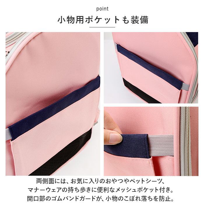 ・両側面には、お気に入りのおやつやペットシーツ、マナーウェアの持ち歩きに便利なメッシュポケット付き。開口部のゴムバンドガードが、小物のこぼれ落ちを防止。