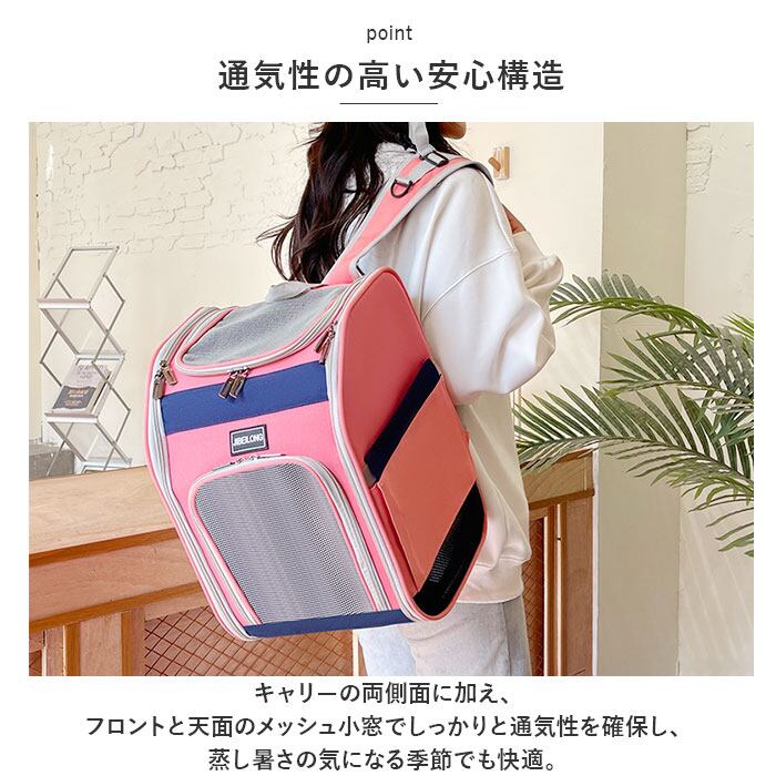 ・キャリーの両側面に加え、フロントと天面のメッシュ小窓でしっかりと通気性を確保し、蒸し暑さの気になる季節でも快適。