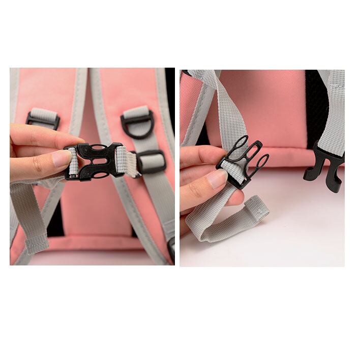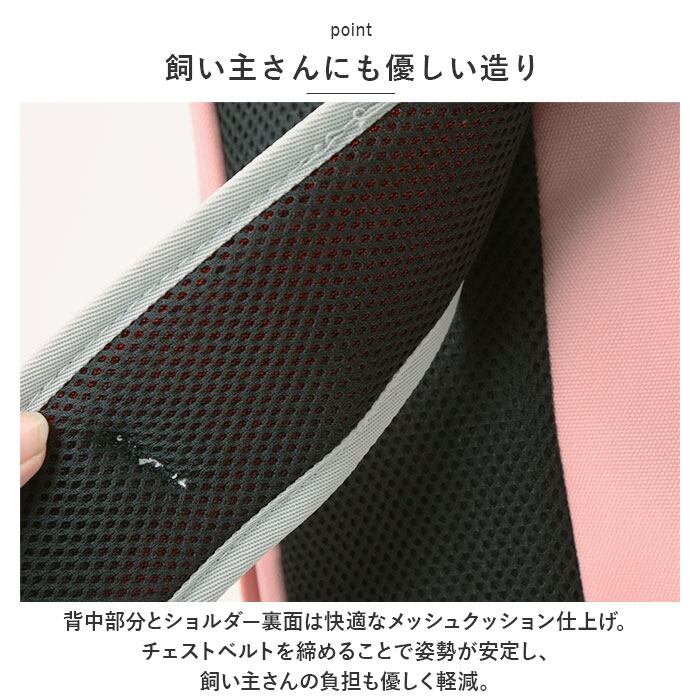 ・背中部分とショルダー裏面は快適なメッシュクッション仕上げ。チェストベルトを締めることで姿勢が安定し、飼い主さんの負担も優しく軽減。