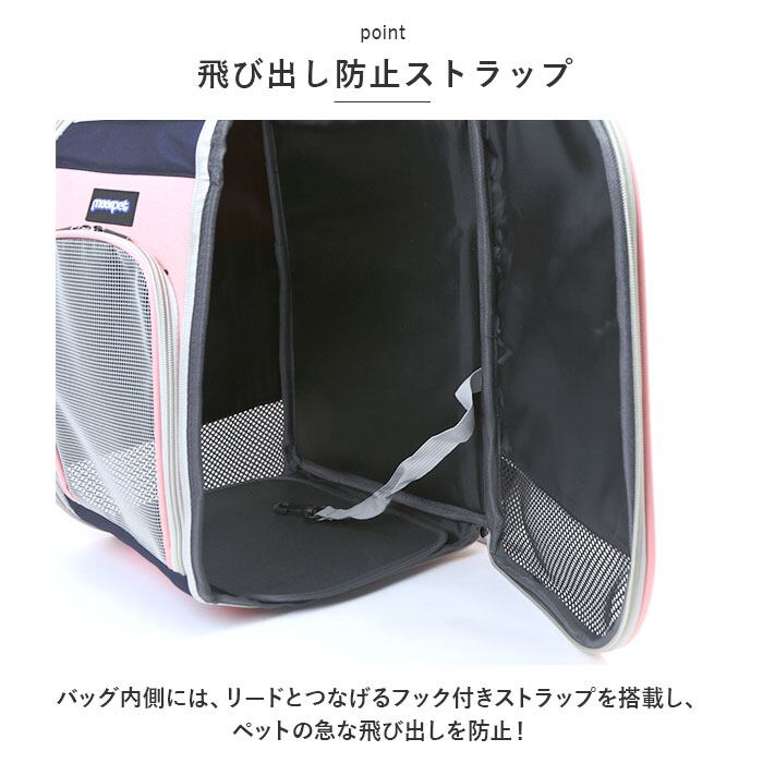 ・バッグ内側には、リードとつなげるフック付きストラップを搭載し、ペットの急な飛び出しを防止!