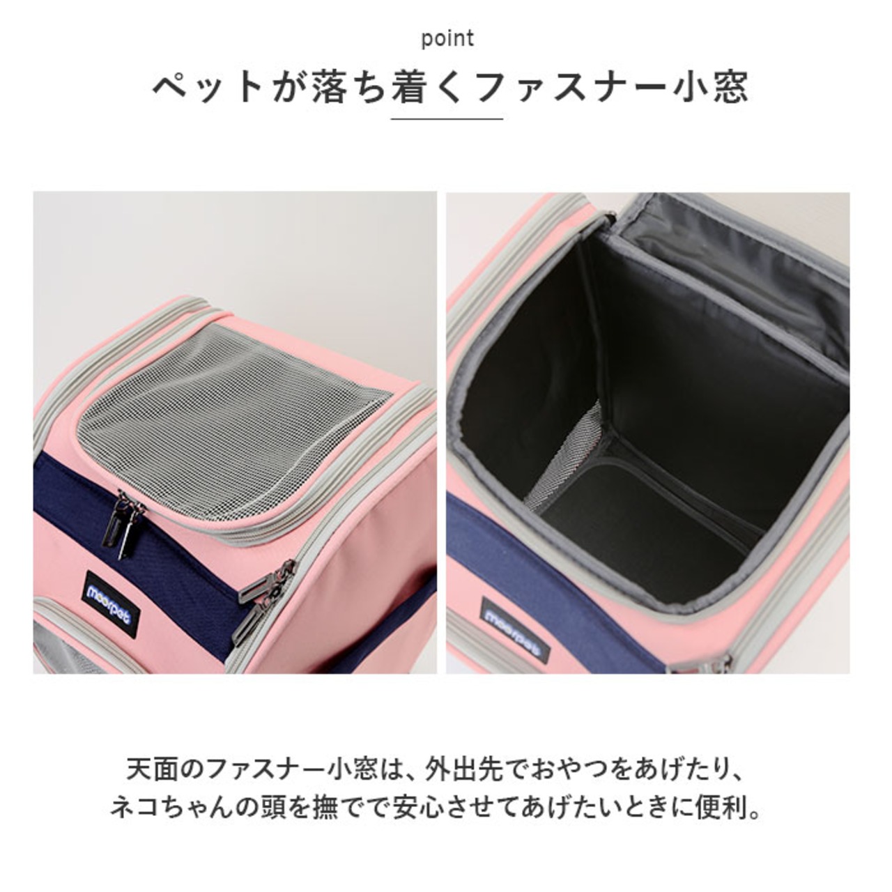 ・天面のファスナー小窓は、外出先でおやつをあげたり、ネコちゃんの頭を撫でで安心させてあげたいときに便利。