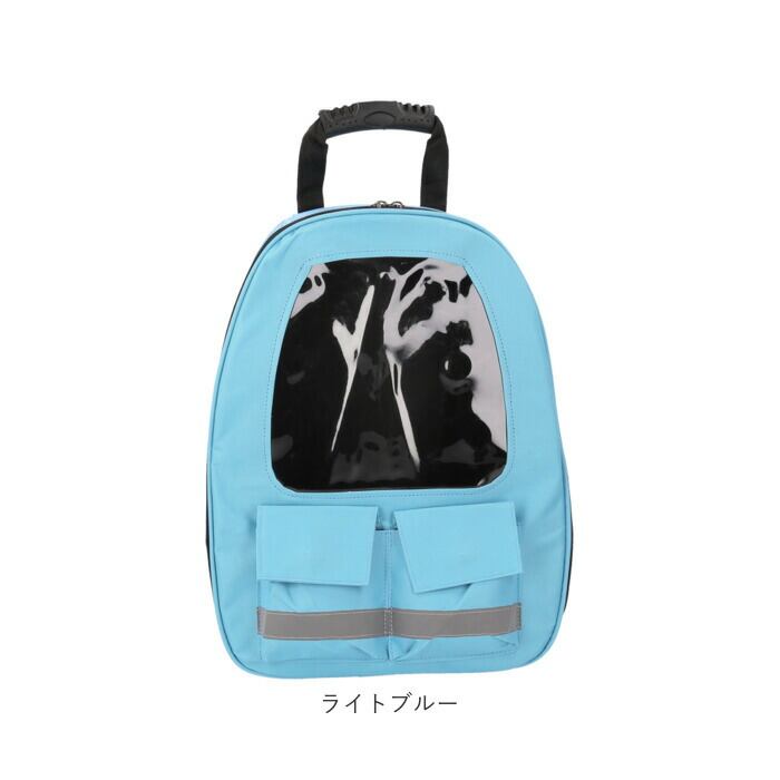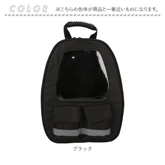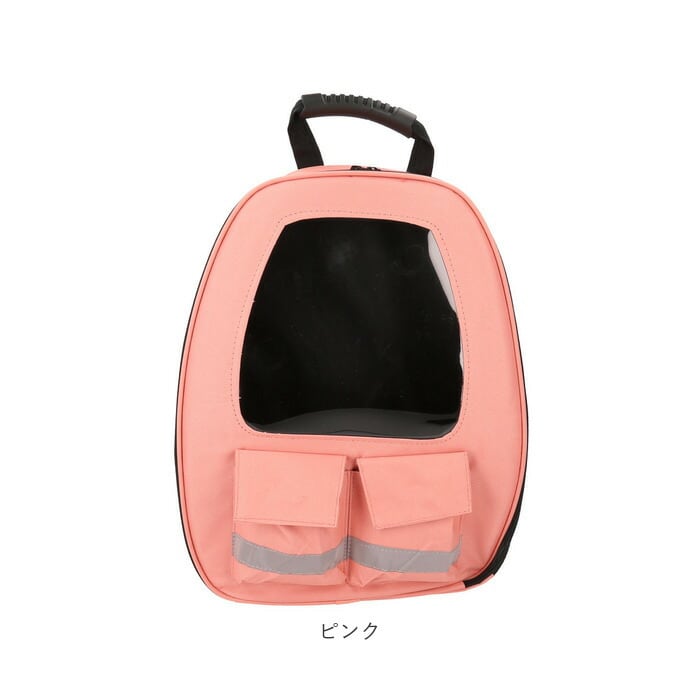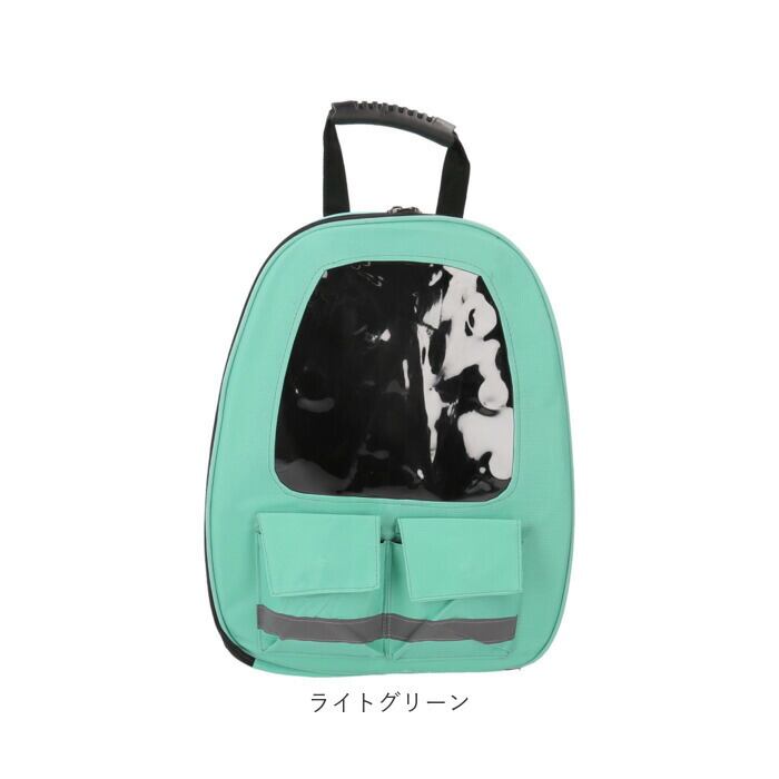 ・クリアウィンドウの付いたキャリー正面は、ラウンドファスナーが大きく開いて出入りがスムーズ!中のペットからも外を眺めることができ、人見知りのネコちゃんでもリラックスできる安心仕様。