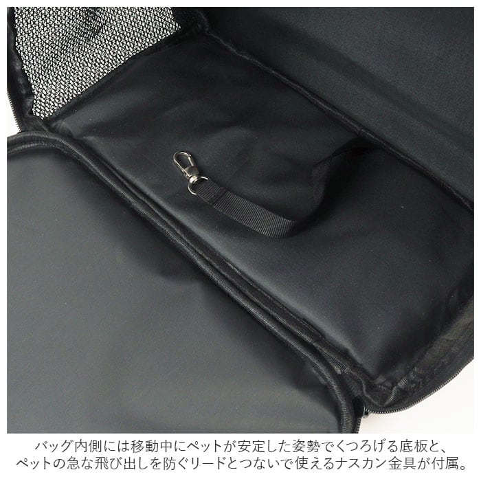 ・バッグ内側には移動中にペットが安定した姿勢でくつろげる底板と、ペットの急な飛び出しを防ぐリードとつないで使えるナスカン金具が付属。