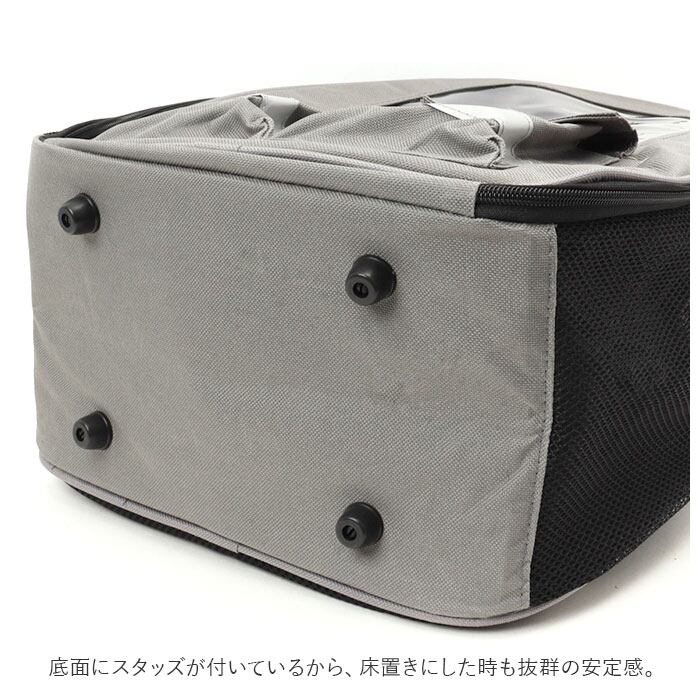 ・両肩に背負えるペットリュックとしてはもちろん、ミニハンドルで手持ちのペットキャリーにもできる2WAY仕様。底面にスタッズが付いているから、床置きにした時も抜群の安定感。