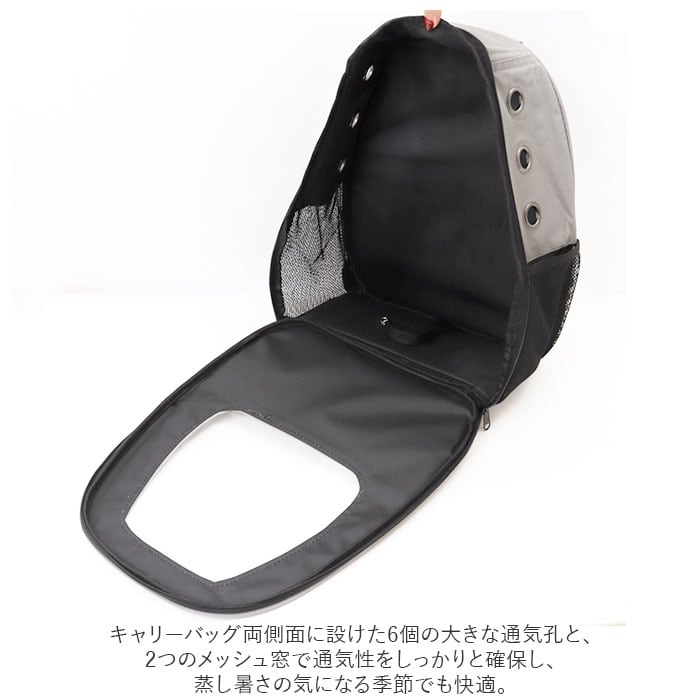 ・キャリーバッグ両側面に設けた6個の大きな通気孔と、2つのメッシュ窓で通気性をしっかりと確保し、蒸し暑さの気になる季節でも快適。