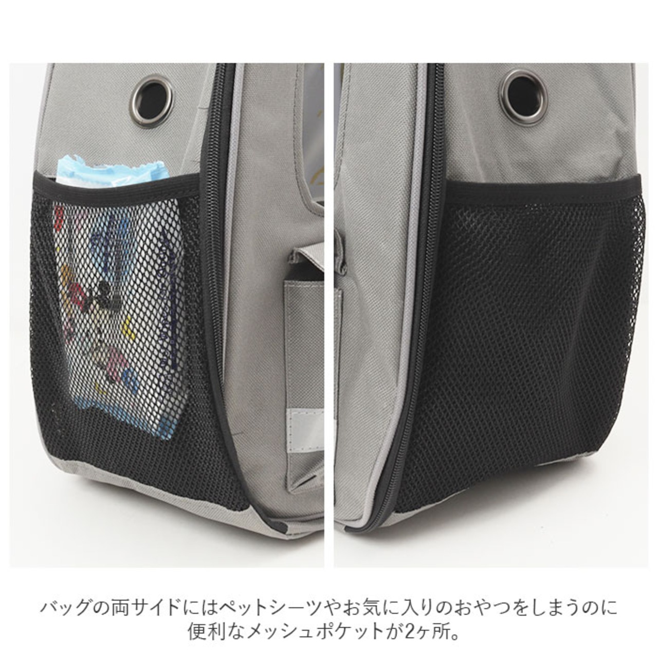 ・バッグの両サイドにはペットシーツやお気に入りのおやつをしまうのに便利なメッシュポケットが2ヶ所。