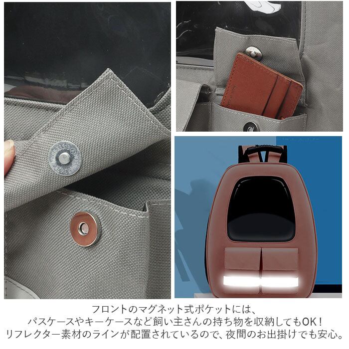 ・フロントのマグネット式ポケットには、パスケースやキーケースなど飼い主さんの持ち物を収納してもOK!リフレクター素材のラインが配置されているので、夜間のお出掛けでも安心。