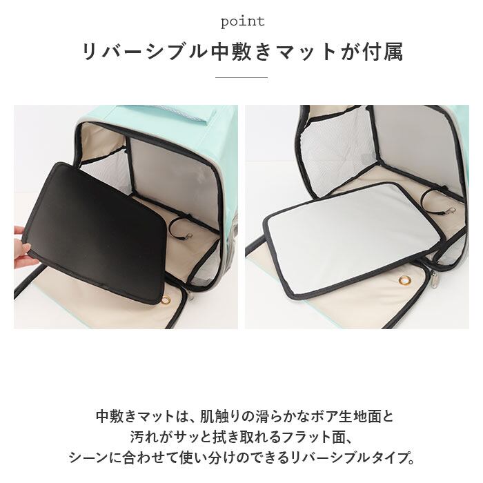 ・中敷きマットは、肌触りの滑らかなボア生地面と汚れがサッと拭き取れるフラット面、シーンに合わせて使い分けのできるリバーシブルタイプ。