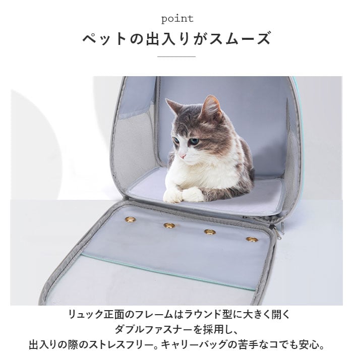 ・リュック正面のフレームはラウンド型に大きく開くダブルファスナーを採用し、出入りの際のストレスフリー。キャリーバッグの苦手なコでも安心。