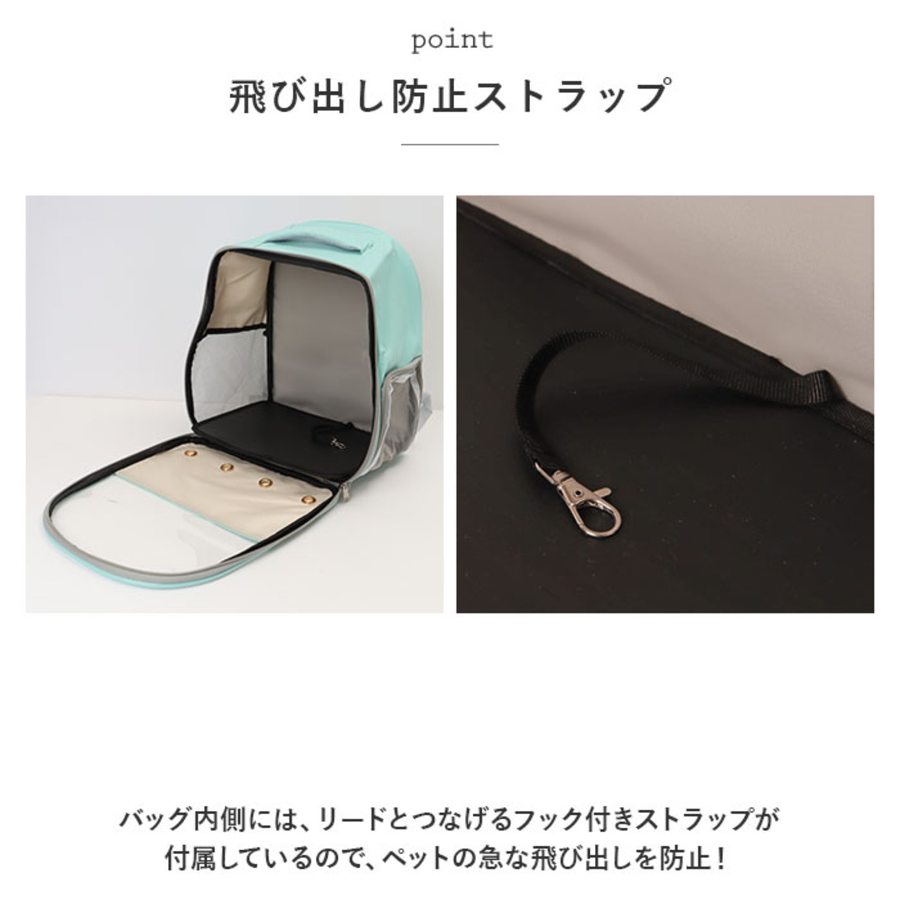 ・バッグ内側には、リードとつなげるフック付きストラップが付属しているので、ペットの急な飛び出しを防止!
