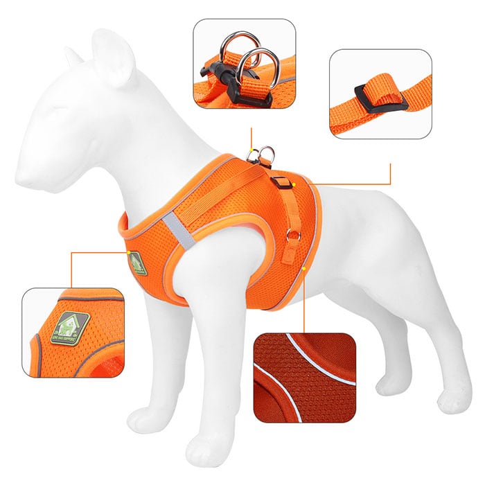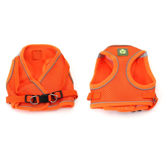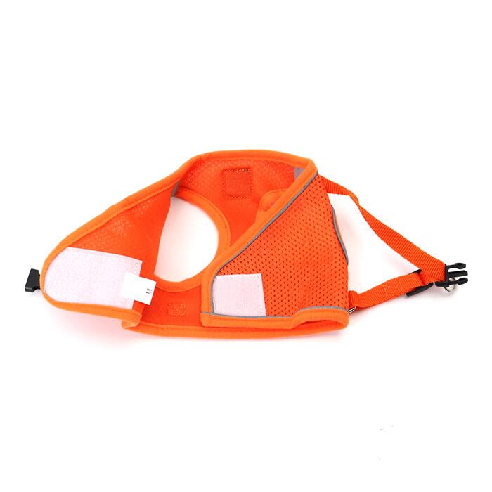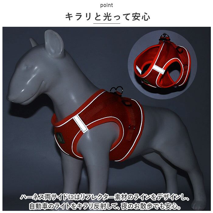 ・ハーネス両サイドにはリフレクター素材のラインをデザインし、自動車のライトをキラリ反射して、夜のお散歩でも安心。