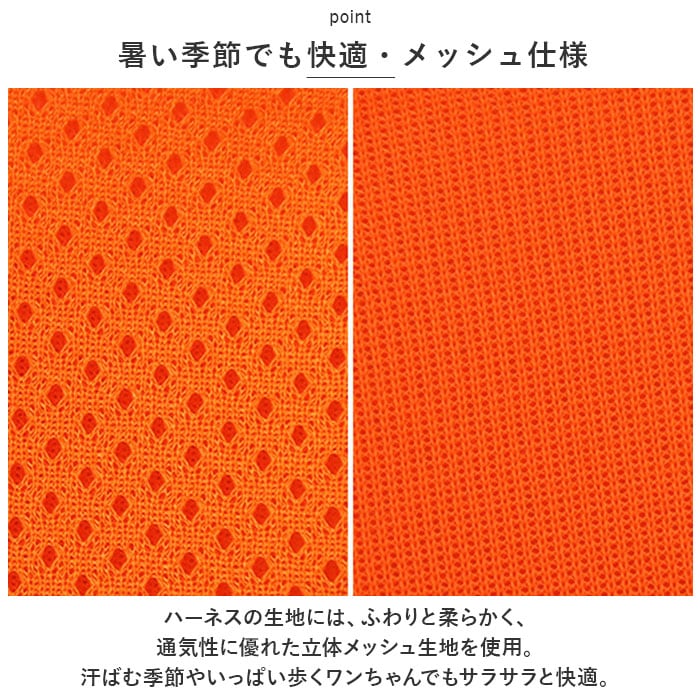 ・ハーネスの生地には、ふわりと柔らかく、通気性に優れた立体メッシュ生地を使用。汗ばむ季節やいっぱい歩くワンちゃんでもサラサラと快適。