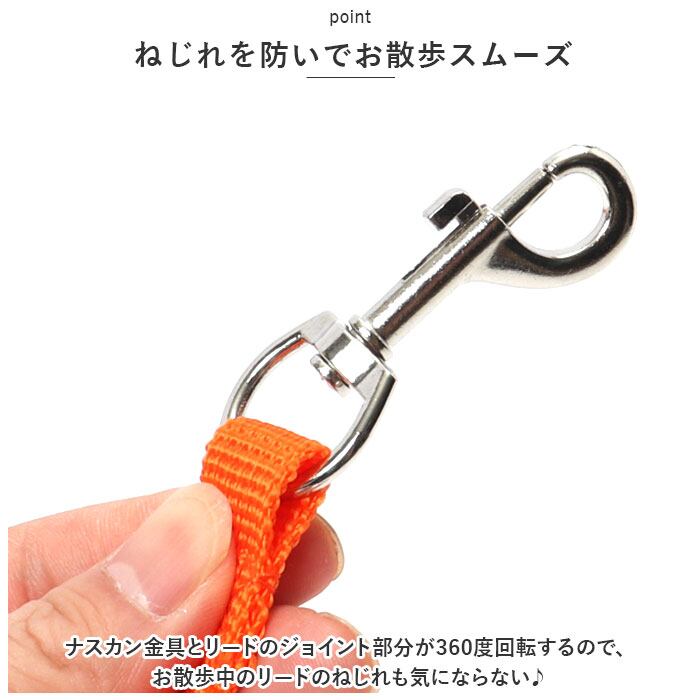 ・ナスカン金具とリードのジョイント部分が360度回転するので、お散歩中のリードのねじれも気にならない♪