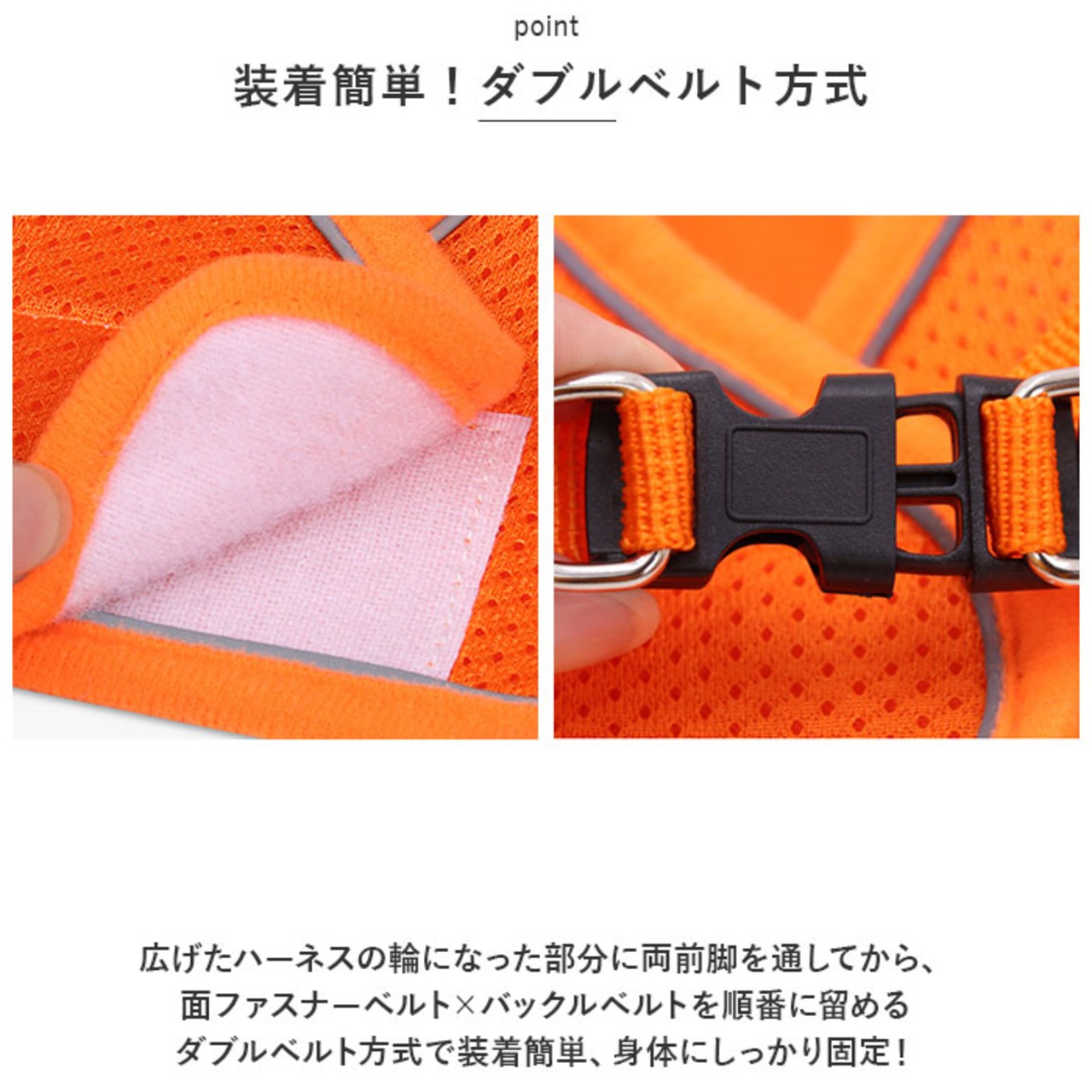 ・広げたハーネスの輪になった部分に両前脚を通してから、面ファスナーベルト×バックルベルトを順番に留めるダブルベルト方式で装着簡単、身体にしっかり固定!
