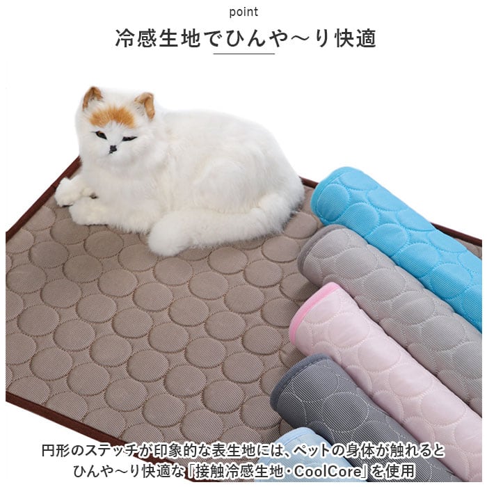 ・円形のステッチが印象的な表生地には、ペットの身体が触れるとひんや~り快適な「接触冷感生地・CoolCore」を使用。