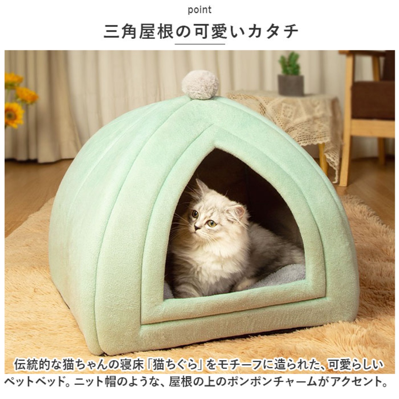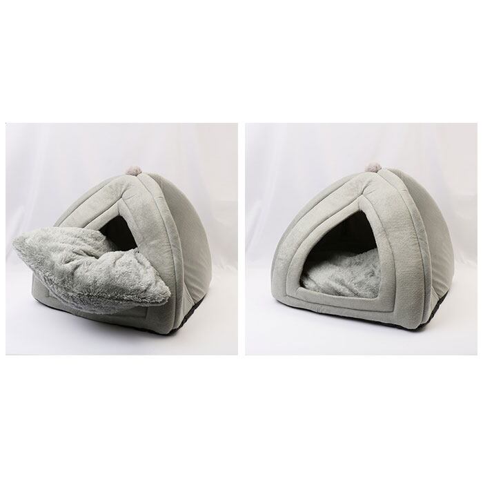 ・伝統的な猫ちゃんの寝床「猫ちぐら」をモチーフに造られた、可愛らしいペットベッド。ニット帽のような、屋根の上のポンポンチャームがアクセント。
