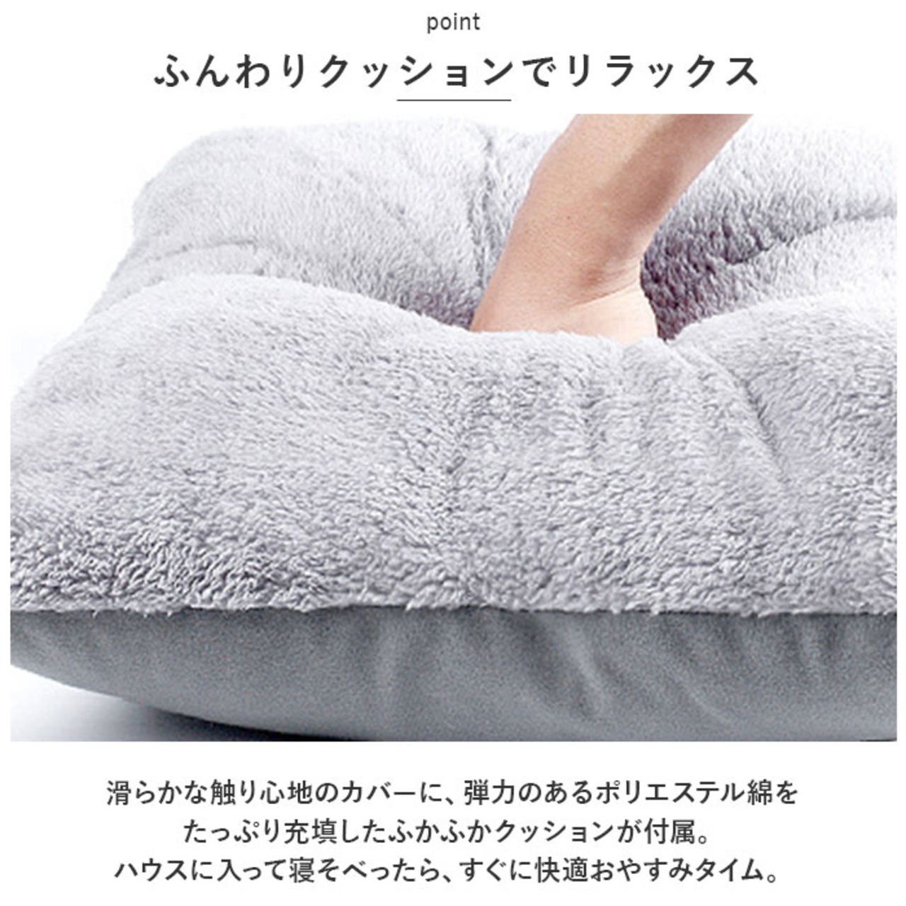 ・滑らかな触り心地のカバーに、弾力のあるポリエステル綿をたっぷり充填したふかふかクッションが付属。ハウスに入って寝そべったら、すぐに快適おやすみタイム。