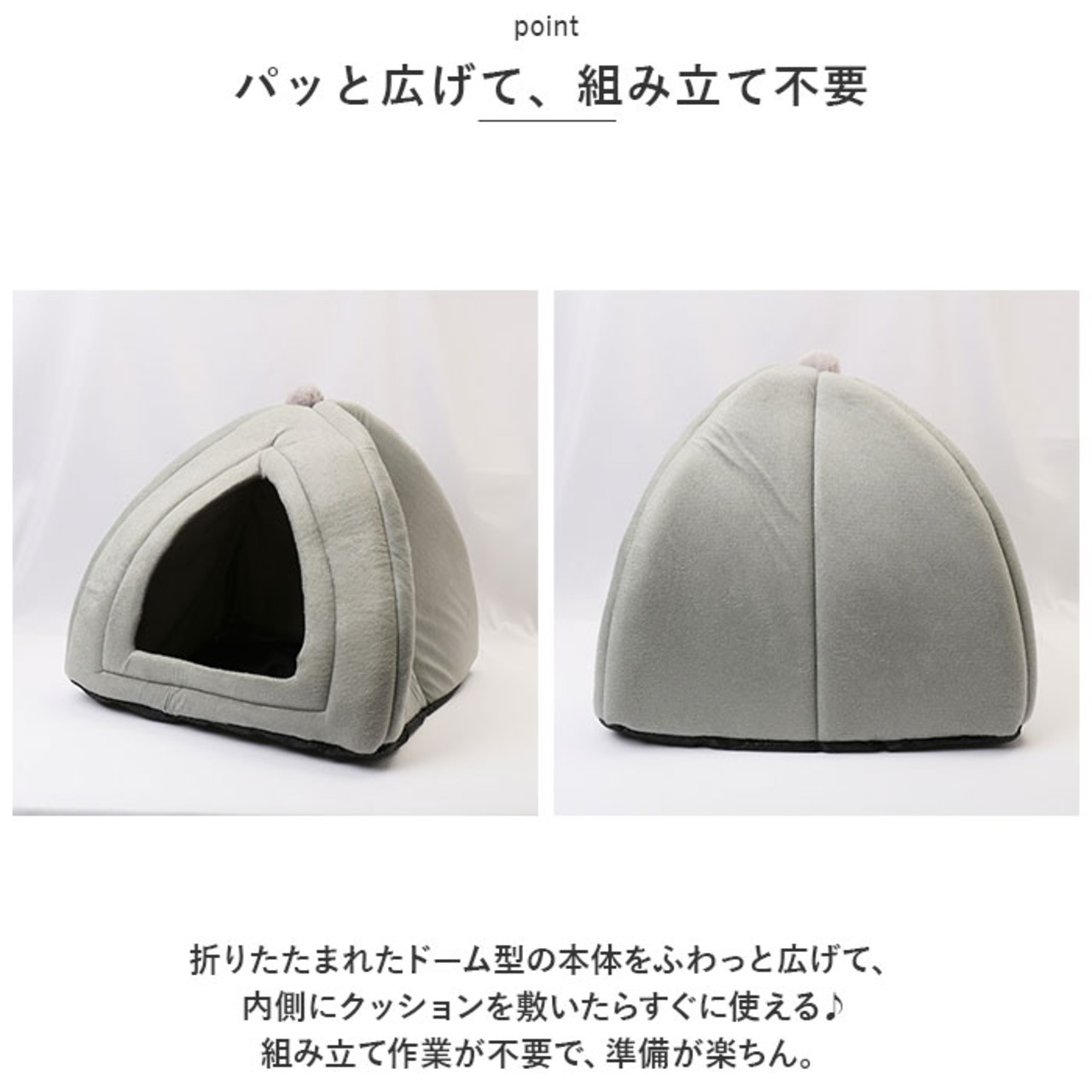 ・折りたたまれたドーム型の本体をふわっと広げて、内側にクッションを敷いたらすぐに使える♪組み立て作業が不要で、準備が楽ちん。