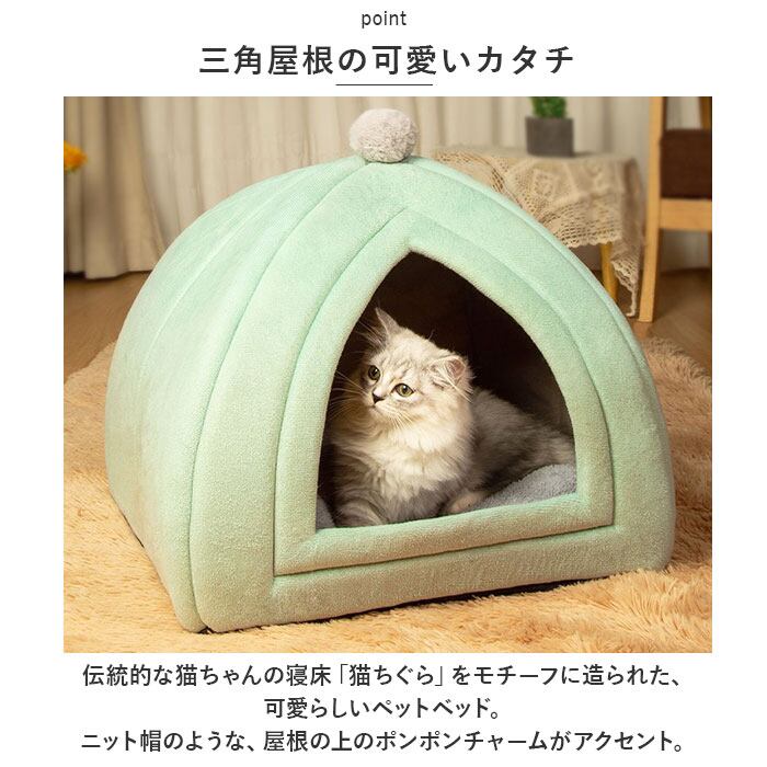 ・伝統的な猫ちゃんの寝床「猫ちぐら」をモチーフに造られた、可愛らしいペットベッド。ニット帽のような、屋根の上のポンポンチャームがアクセント。