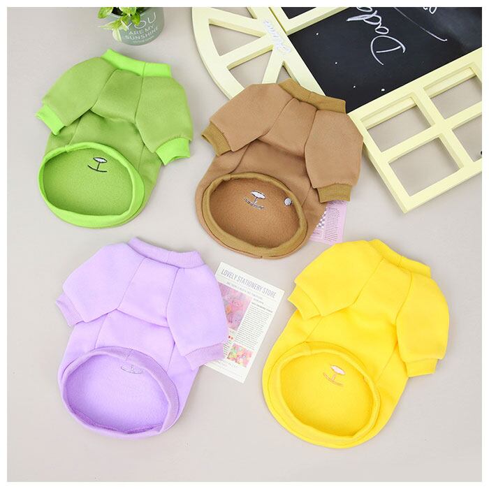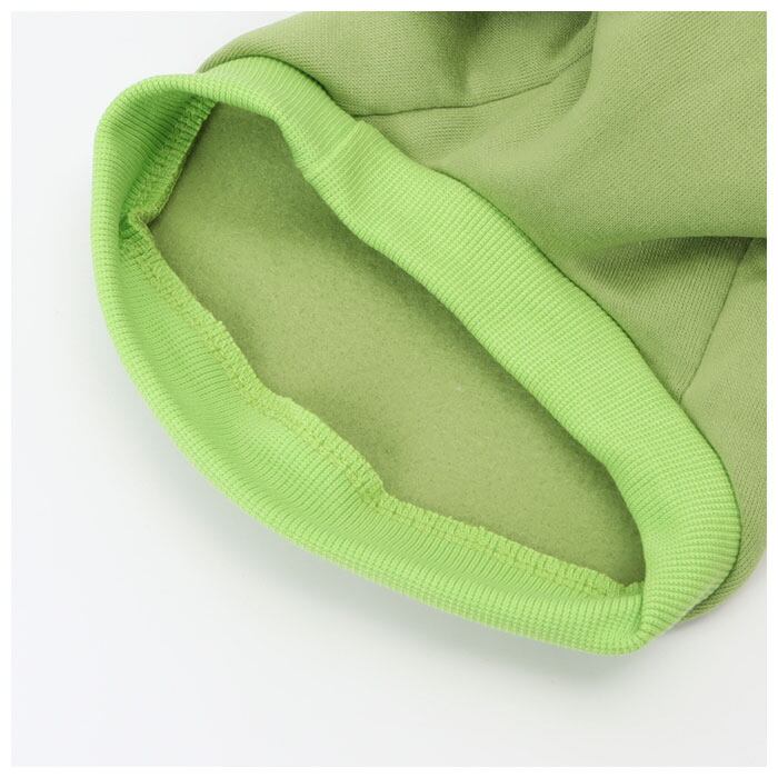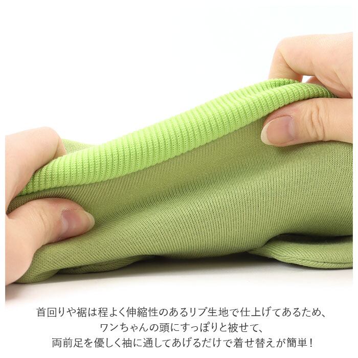・首回りや裾は程よく伸縮性のあるリブ生地で仕上げてあるため、ワンちゃんの頭にすっぽりと被せて、両前足を優しく袖に通してあげるだけで着せ替えが簡単!