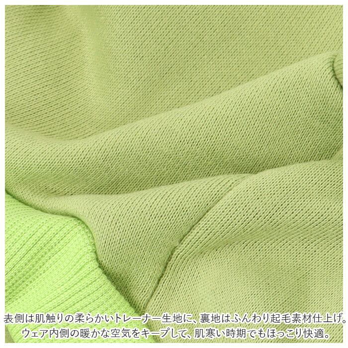 ・表側は肌触りの柔らかいトレーナー生地に、裏地はふんわり起毛素材仕上げ。ウェア内側の暖かな空気をキープして、肌寒い時期でもほっこり快適。