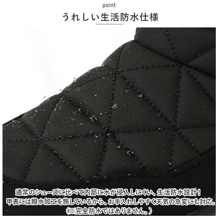 ・通常のシューズに比べて内部に水が侵入しにくい、生活防水設計!甲表には撥水加工を施しているから、お手入れしやすく天気の急変にも対応。(※完全防水ではありません。)