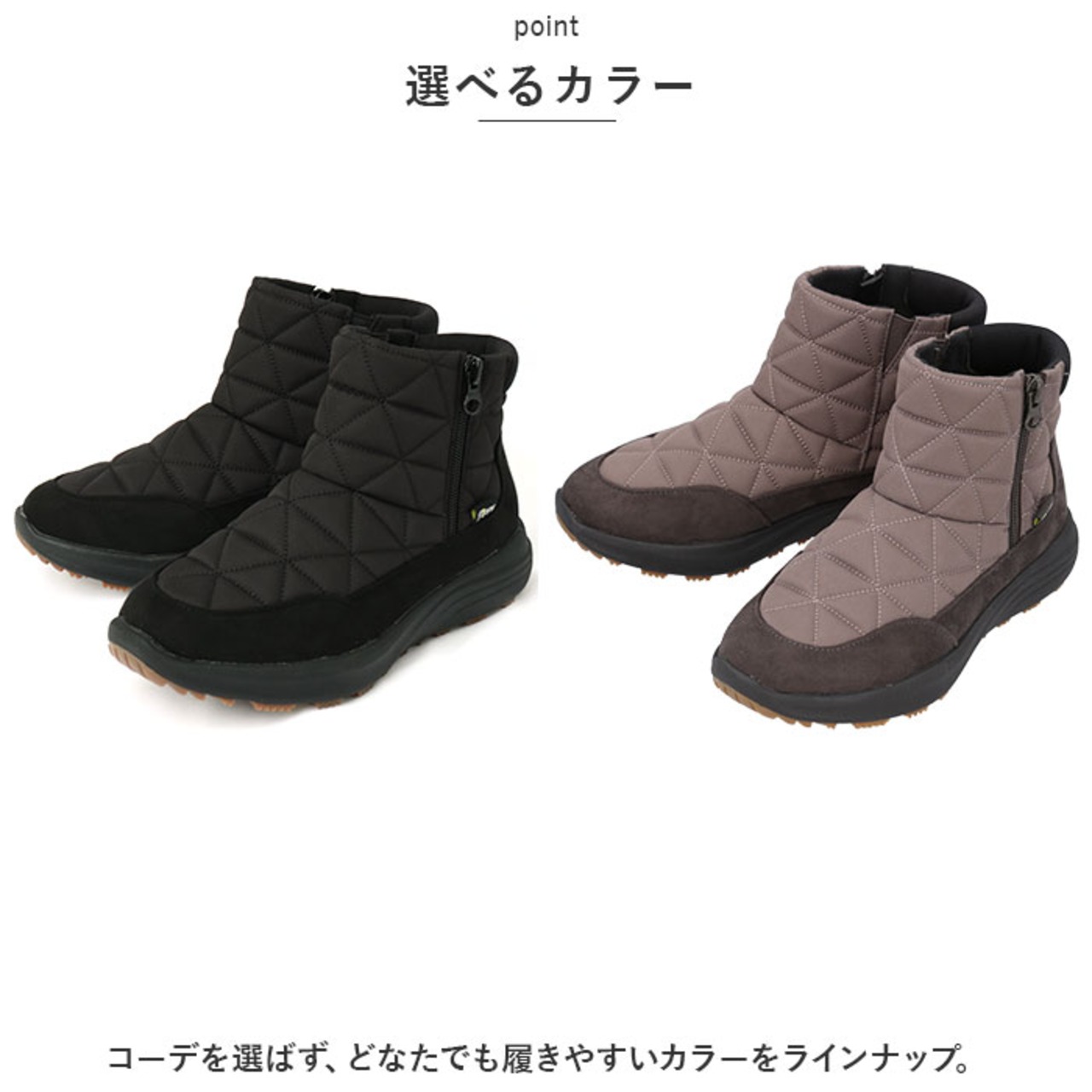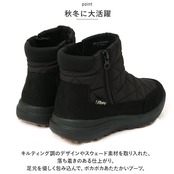 ・キルティング調のデザインやスウェード素材を取り入れた、落ち着きのある仕上がり。足元を優しく包み込んで、ポカポカあたたかいブーツ。