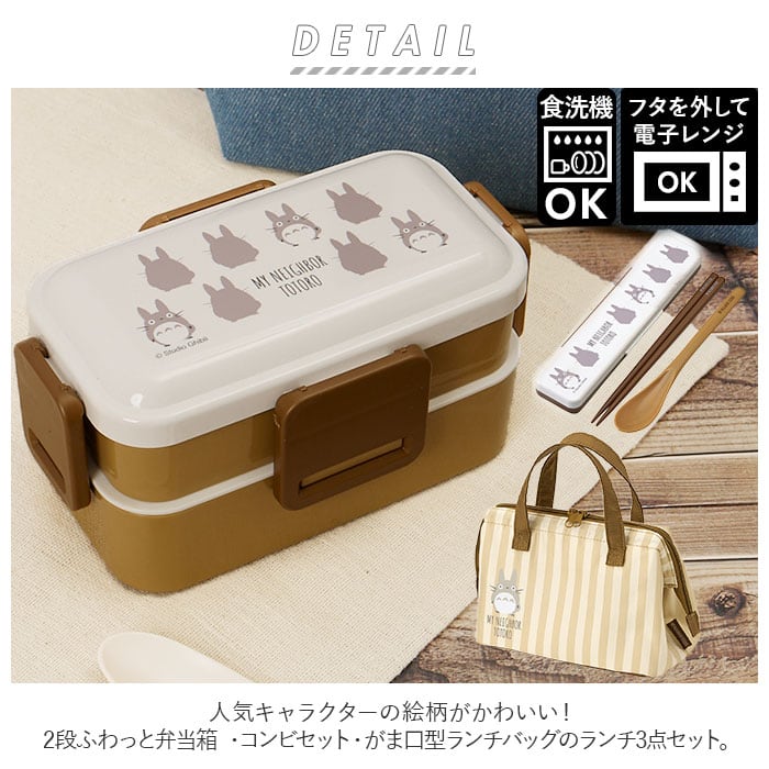 ・人気キャラクターの絵柄がかわいい!2段ふわっと弁当箱 ・コンビセット・がま口型ランチバッグのランチ3点セット。