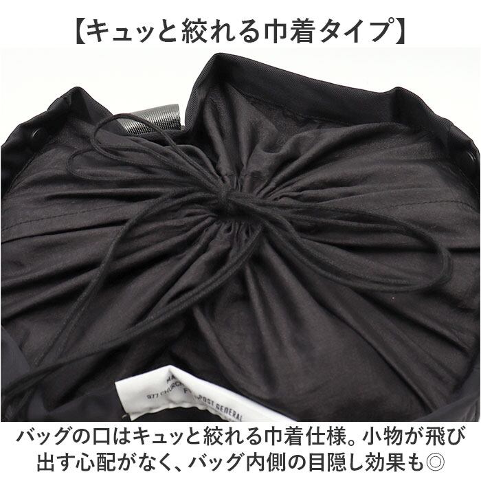 ・バッグの口はキュッと絞れる巾着仕様。小物が飛び出す心配がなく、バッグ内側の目隠し効果も◎