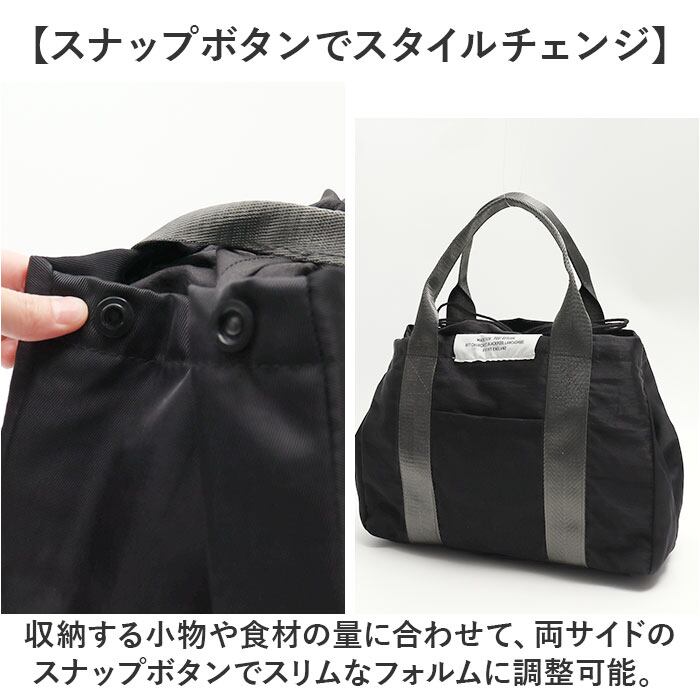 ・収納する小物や食材の量に合わせて、両サイドのスナップボタンでスリムなフォルムに調整可能。