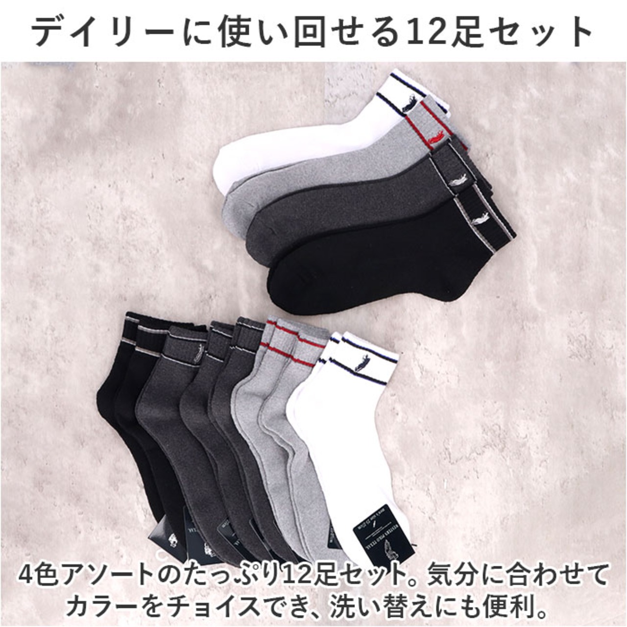 ・4色アソートのたっぷり12足セット。気分に合わせてカラーをチョイスでき、洗い替えにも便利。
