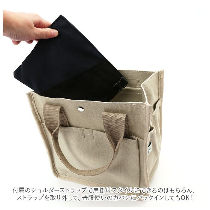 ・付属のショルダーストラップで肩掛けスタイルにできるのはもちろん、ストラップを取り外して、普段使いのカバンにバックインしてもOK!