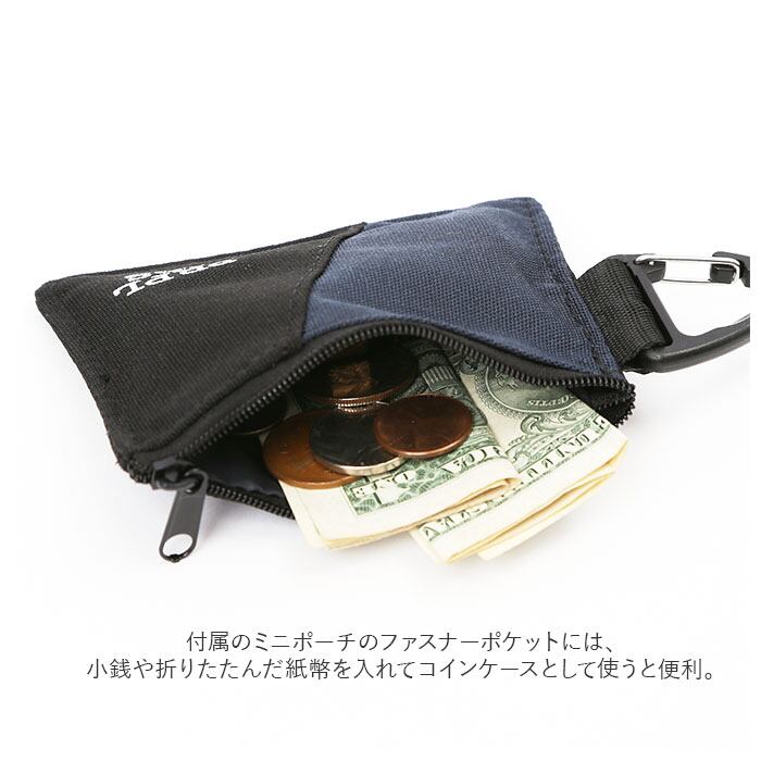 ・付属のミニポーチのファスナーポケットには、小銭や折りたたんだ紙幣を入れてコインケースとして使うと便利。