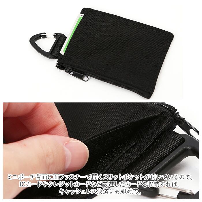 ・ミニポーチ背面に面ファスナーで開くスリットポケットが付いているので、ICカードやクレジットカードなど厳選したカードを収納すれば、キャッシュレス決済にも即対応。