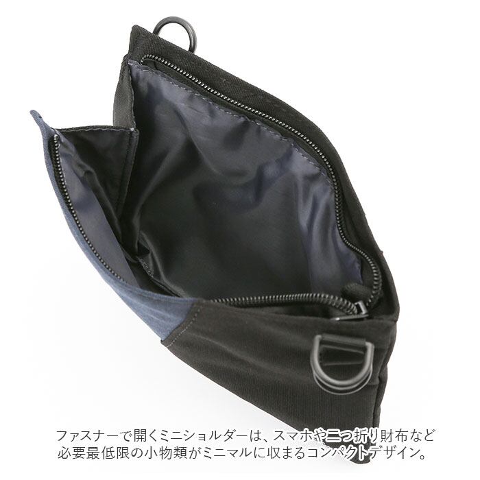 ・ファスナーで開くミニショルダーは、スマホや二つ折り財布など必要最低限の小物類がミニマルに収まるコンパクトデザイン。