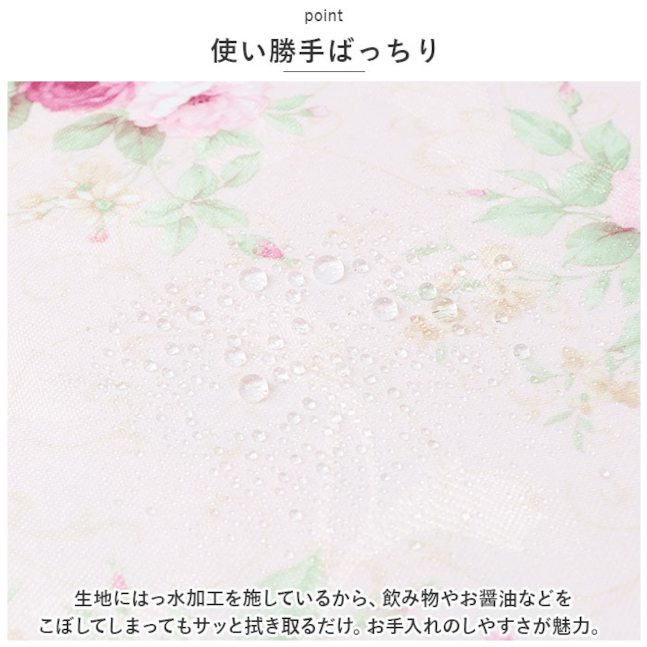 ・生地にはっ水加工を施しているから、飲み物やお醤油などをこぼしてしまってもサッと拭き取るだけ。お手入れのしやすさが魅力。