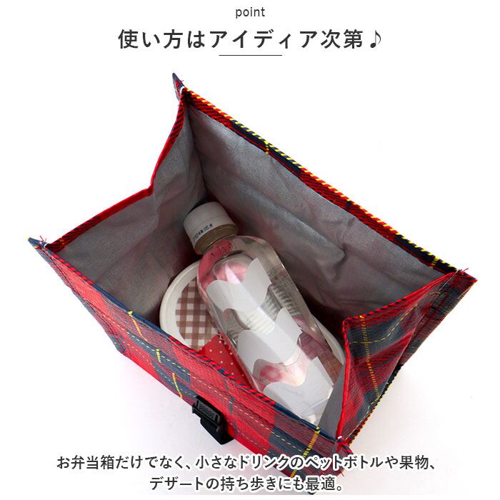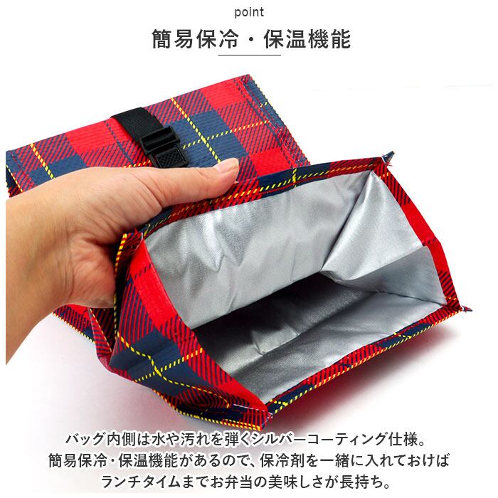 ・バッグ内側は水や汚れを弾くシルバーコーティング仕様。簡易保冷・保温機能があるので、保冷剤を一緒に入れておけばランチタイムまでお弁当の美味しさが長持ち。