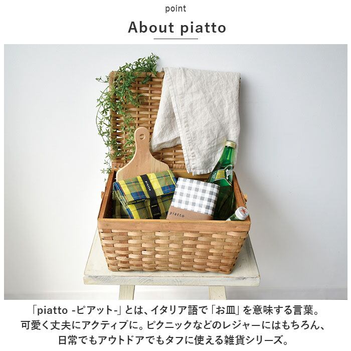 「piatto -ピアット-」とは、イタリア語で「お皿」を意味する言葉。可愛く丈夫にアクティブに。ピクニックなどのレジャーにはもちろん、日常でもアウトドアでもタフに使える雑貨シリーズ。