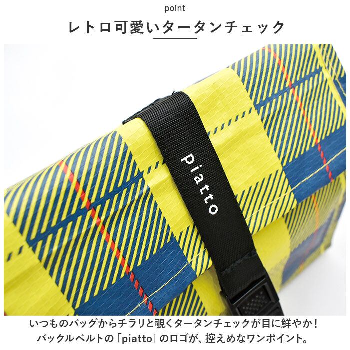 ・いつものバッグからチラリと覗くタータンチェックが目に鮮やか!バックルベルトの「piatto」のロゴが、控えめなワンポイント。