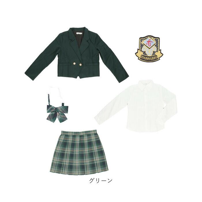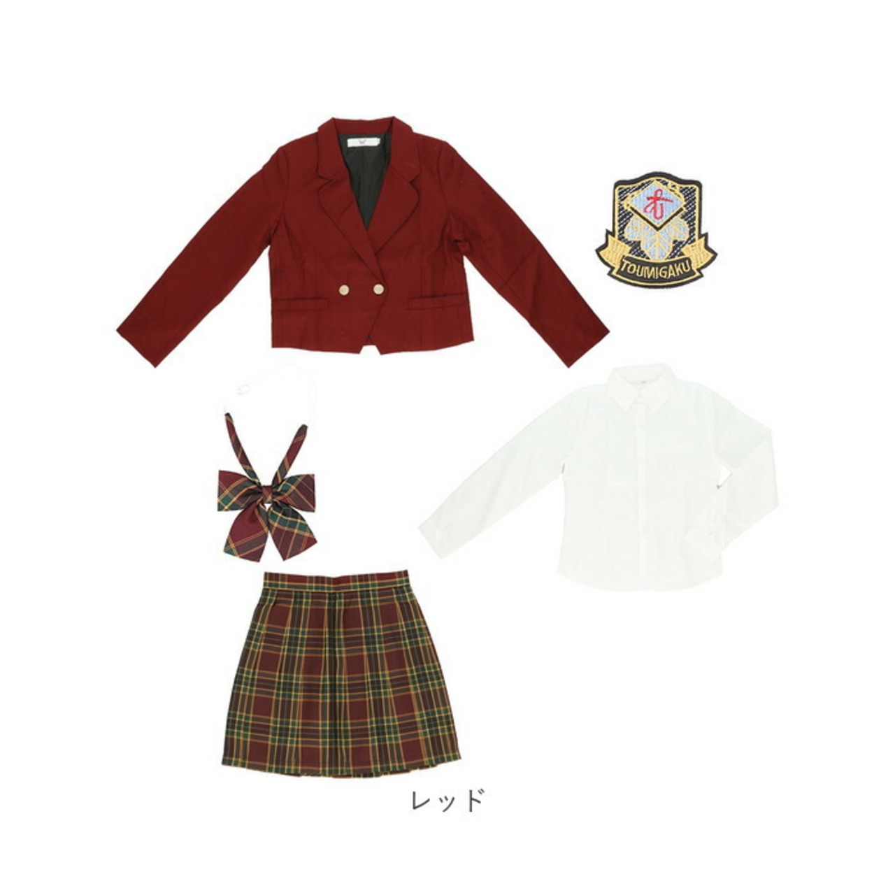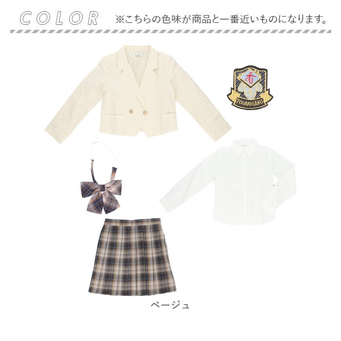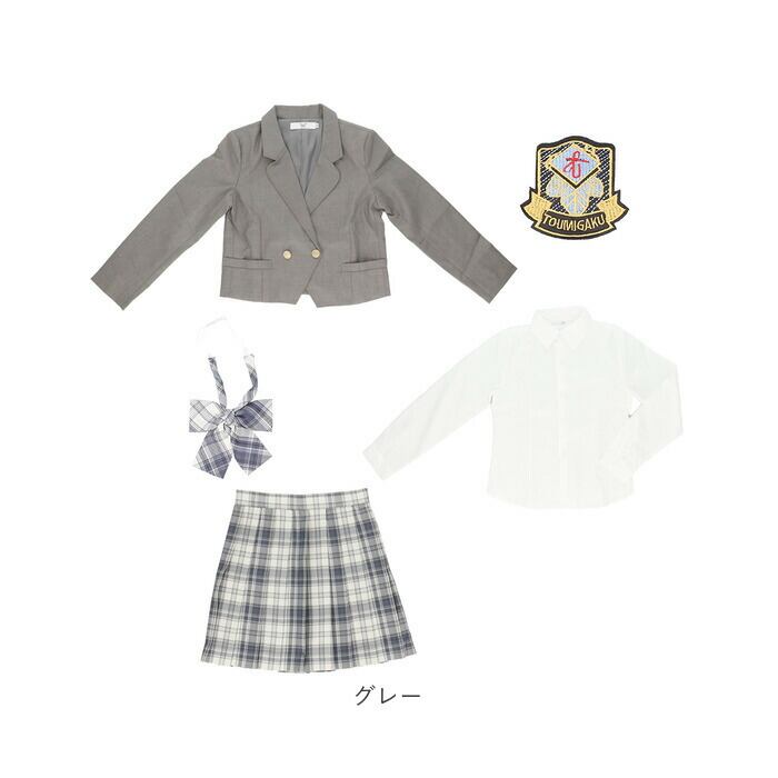 1つのセットでワンコーデが完了!ブレザー、ブラウス、スカート、リボン、エンブレムの5点セット。取り外し可能なエンブレムが学園感を演出★それぞれ単体で使ってもオシャレなアイテム◎