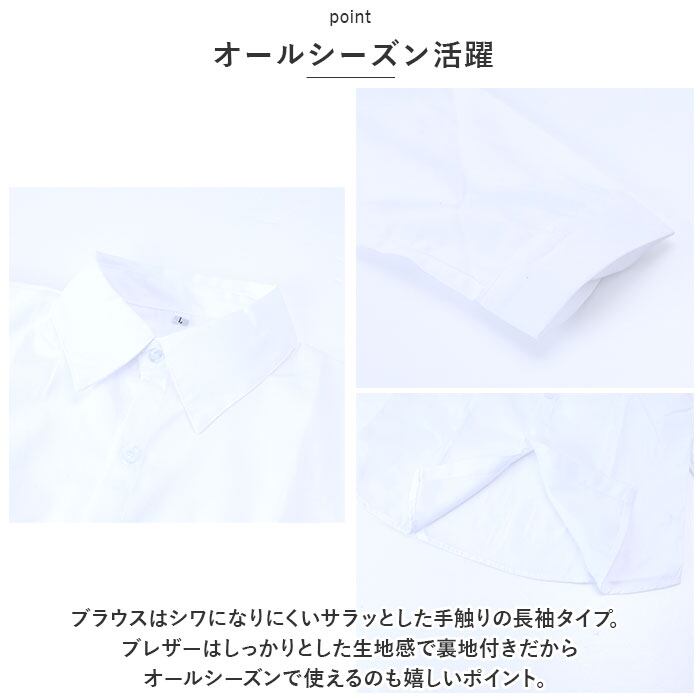 ・ブラウスはシワになりにくいサラッとした手触りの長袖タイプ。ブレザーはしっかりとした生地感で裏地付きだからオールシーズンで使えるのも嬉しいポイント。