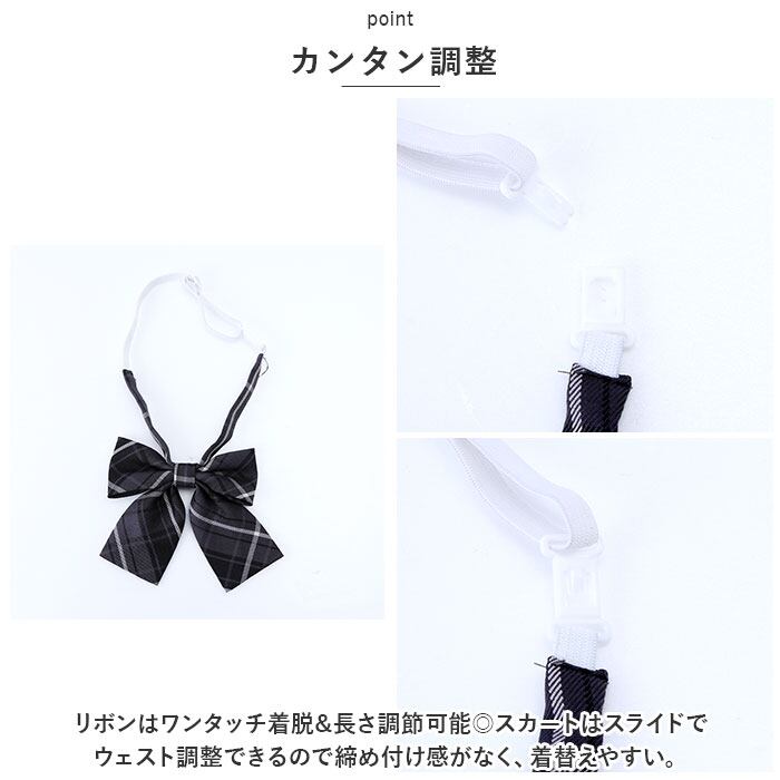 ・リボンはワンタッチ着脱&長さ調節可能◎スカートはスライドでウェスト調整できるので締め付け感がなく、着替えやすい。