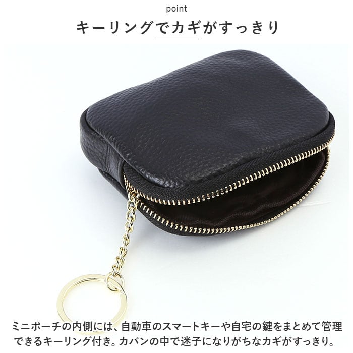 ・ミニポーチの内側には、自動車のスマートキーや自宅の鍵をまとめて管理できるキーリング付き。カバンの中で迷子になりがちなカギがすっきり。