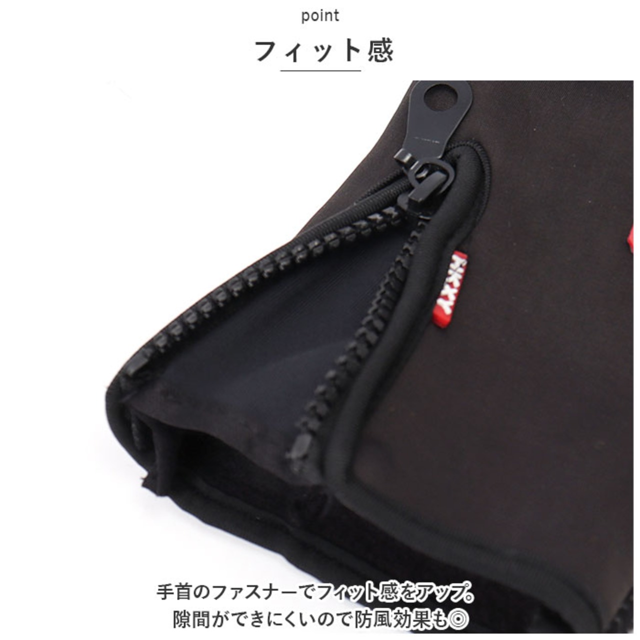 ・手首のファスナーでフィット感をアップ。隙間ができにくいので防風効果も◎