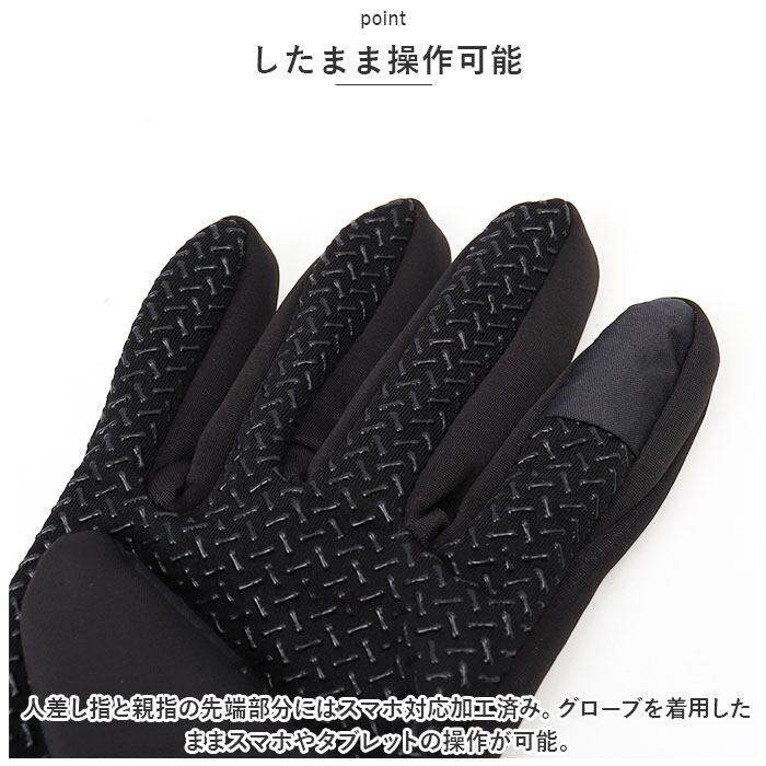 ・人差し指と親指の先端部分にはスマホ対応加工済み。グローブを着用したままスマホやタブレットの操作が可能。