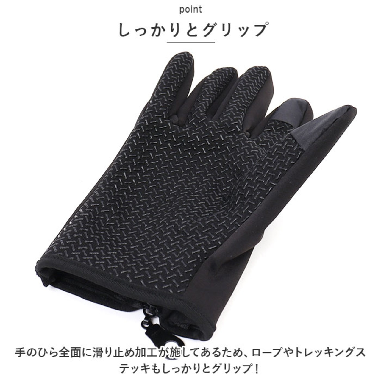 ・手のひら全面に滑り止め加工が施してあるため、ロープやトレッキングステッキもしっかりとグリップ!