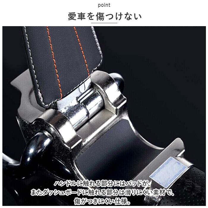 ・ハンドルに触れる部分にはパッドが、またダッシュボードに触れる部分は滑りにくい素材で、傷がつきにくい仕様。
