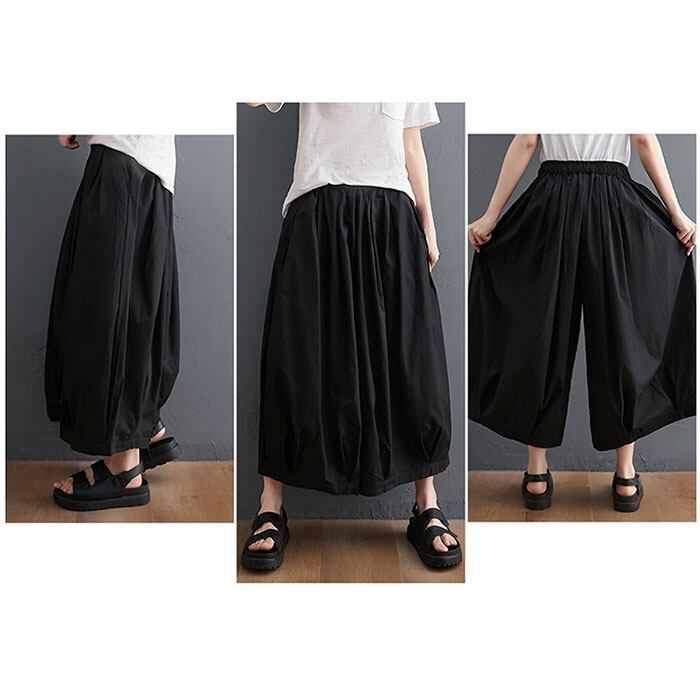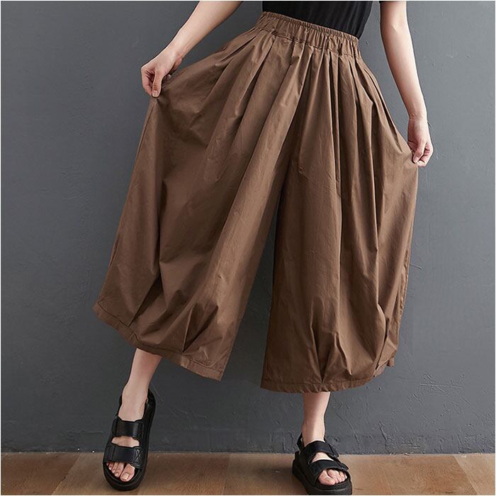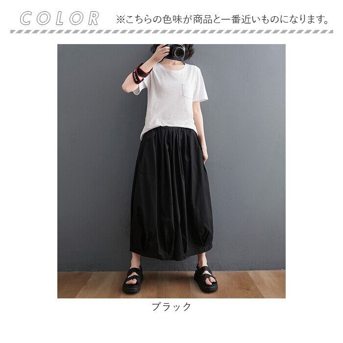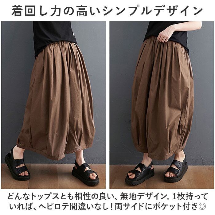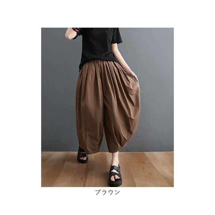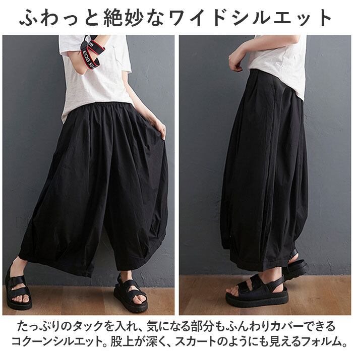 ・たっぷりのタックを入れ、気になる部分もふんわりカバーできるコクーンシルエット。股上が深く、スカートのようにも見えるフォルム。