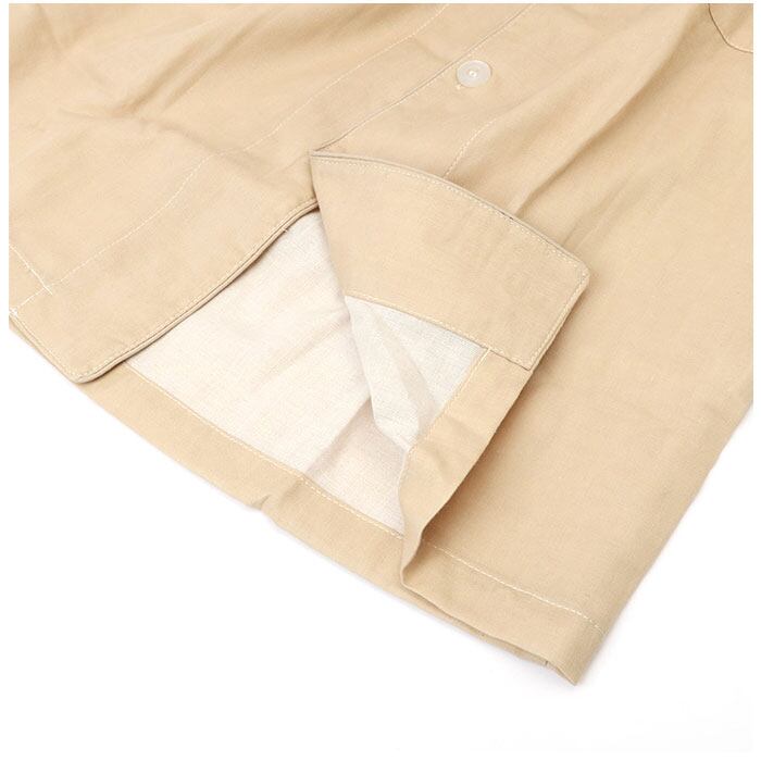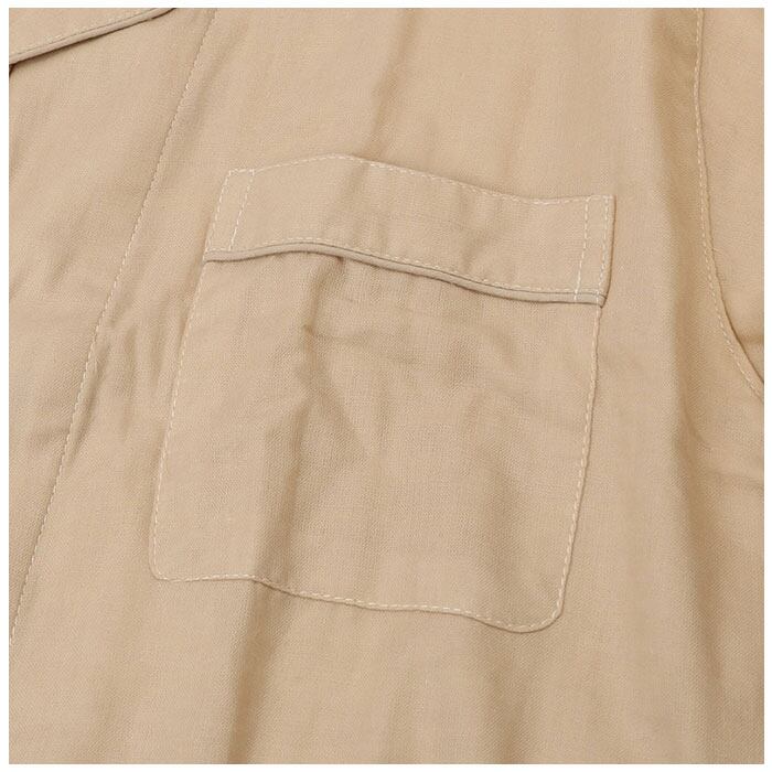・トップスはゆったり感のあるオープンシャツタイプ。左胸にポケットをあしらったデザイン。