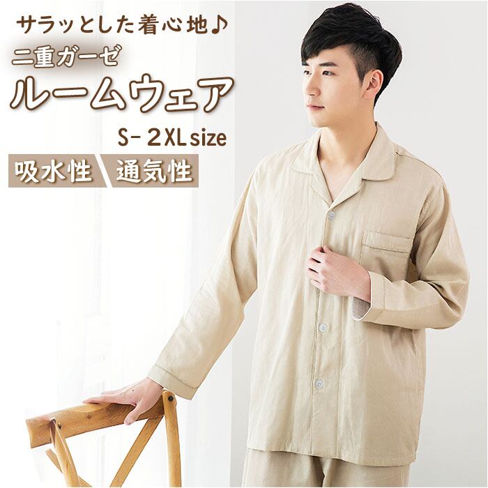 パジャマ メンズ 通販 ガーゼ 綿100% メンズパジャマ メンズルームウェア ルームウェア 上下セット 長袖 長ズボン 二重ガーゼ ダブルガーゼ 部屋着 柔らかい 前開き ボタン 春 夏 秋 冬